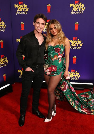 Madison bailey boasts a colorful ruffled train while rudy pankow and chase stokes lean into monochromatic looks, with pankow in black and.