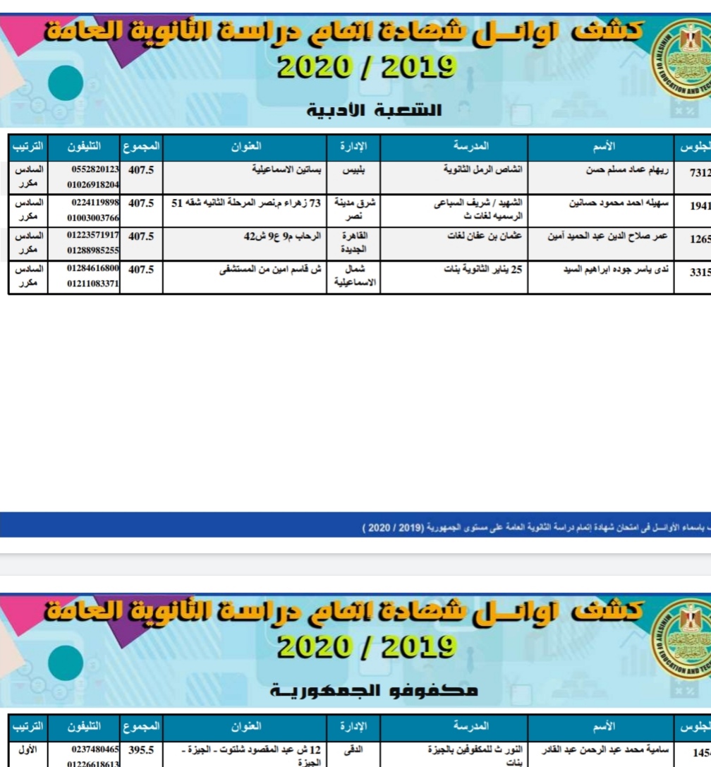 ايمان سهيل خليل ابو حصيره. أما العشرة الأوائل للفرعين الأدبي والعلمي، فكانت على النحو الآتي: أسماء أوائل الثانوية العامة لعام 2020. وقال وزير التربية والتعليم إن 30 طالبا من أوائل الثانوية العامة 2020 كانوا من أبناء المدارس الحكومية، و3 أوائل من المدارس الرسمية لغات، وطالب واحد من المدارس الخاصة. الصفحة الرسمية للأستاذ محمد عبد المعبود على فيس بوكfb page: